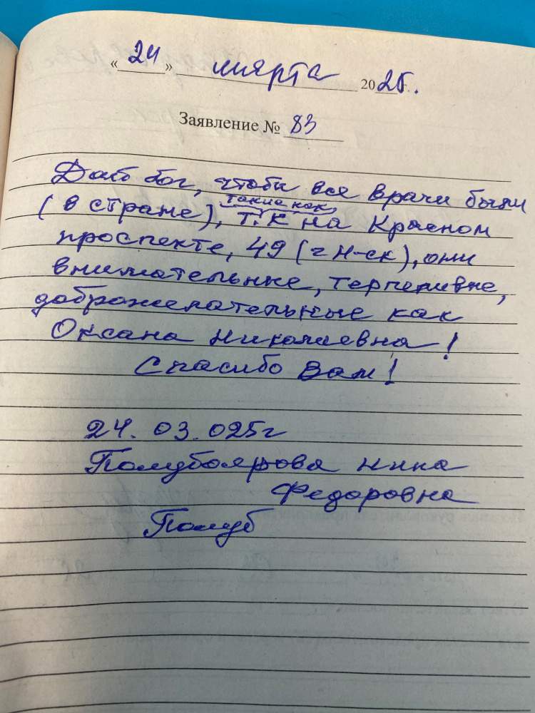 Дай Бог, чтобы все врачи были (в стране), такие как на Красном проспекте. 49 ( г. Новосибирск), они внимательные, терпеливые, доброжелательные, как Оксана Николаевна! Спасибо Вам!