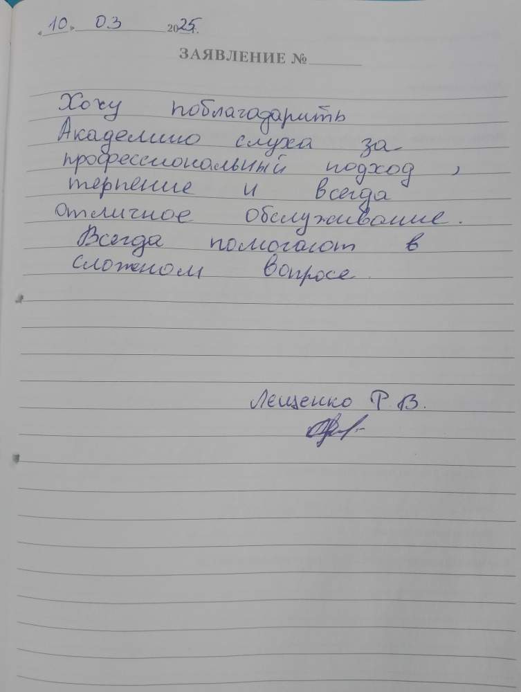 Хочу поблагодарить Академию слуха за профессиональный подход, терпение и всегда отличное обслуживание. Всегда помогают в сложном вопросе .