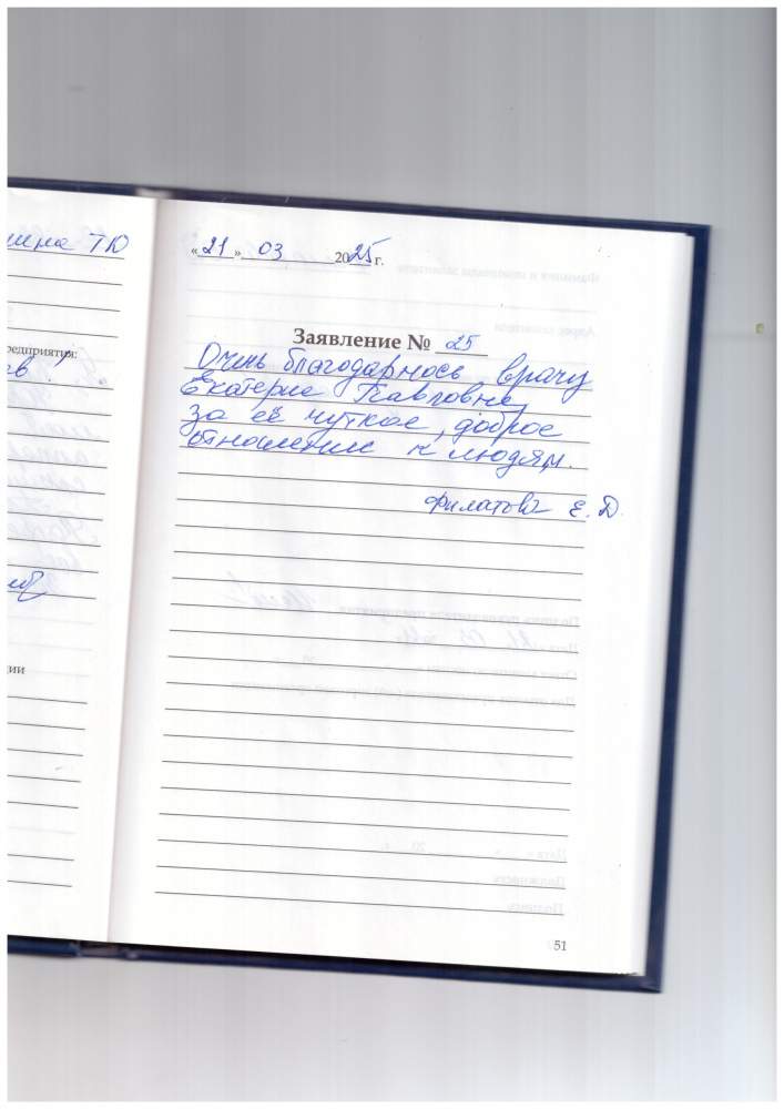 Очень благодарность врачу Екатерине Павловне за ее чуткое, доброе отношение к людям. Филатова ЕД.
