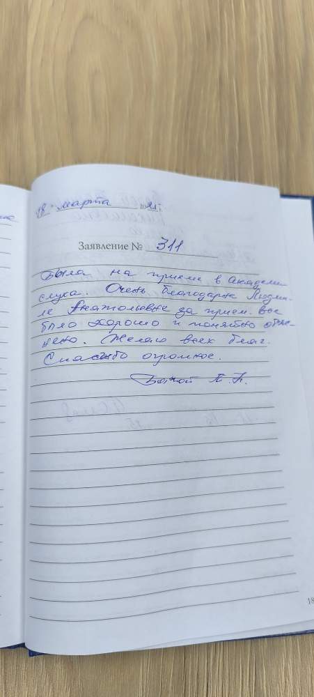 18.03.2025 Была на приеме в Академии слуха. Очень благодарна Людмиле Анатольевне за прием. Все было хорошо и понятно объяснено. Желаю всех благ. Спасибо огромное. Бачой Т.Н.