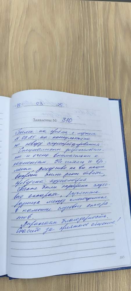 15.03.2025 Были на приеме с мужем 15.03.2025 на консультации по поводу слухопротезирования. Специалисты доброжелательные и очень внимательны к пациентам. Не считаясь со временем, доходчиво на все наши вопросы были даны ответы, проведена аудиометрия. Также были подобраны слуховые аппараты, разъяснена разница между имеющимися в наличии слуховых аппаратов. Выражаем благодарность. Спасибо за приятное общение!