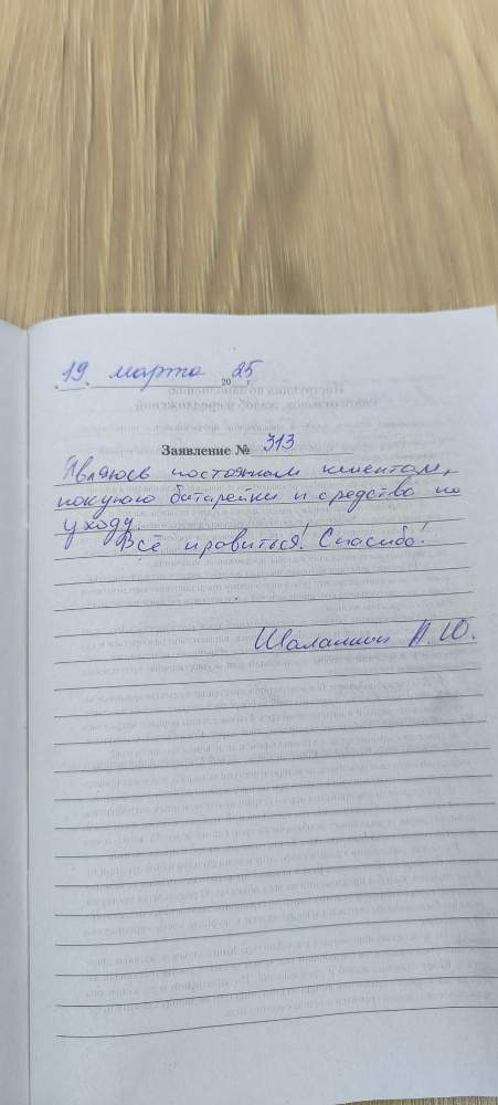 19.03.2025 Являюсь постоянным клиентом, покупаю батарейки и средства по уходу. Всё нравиться! Спасибо! Шаламин А.Ю.