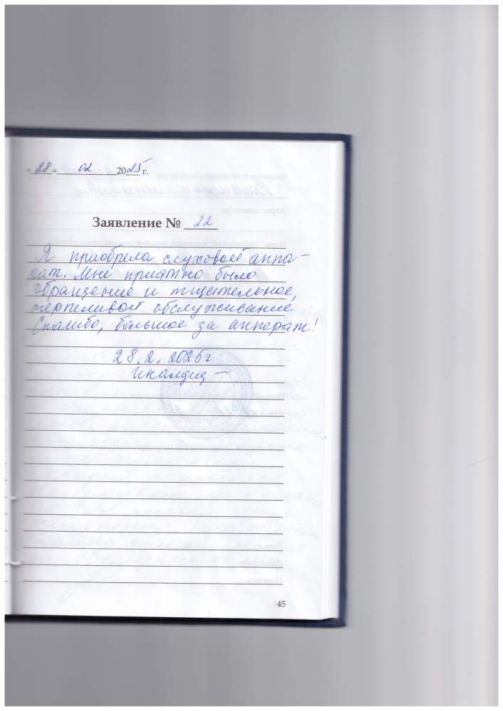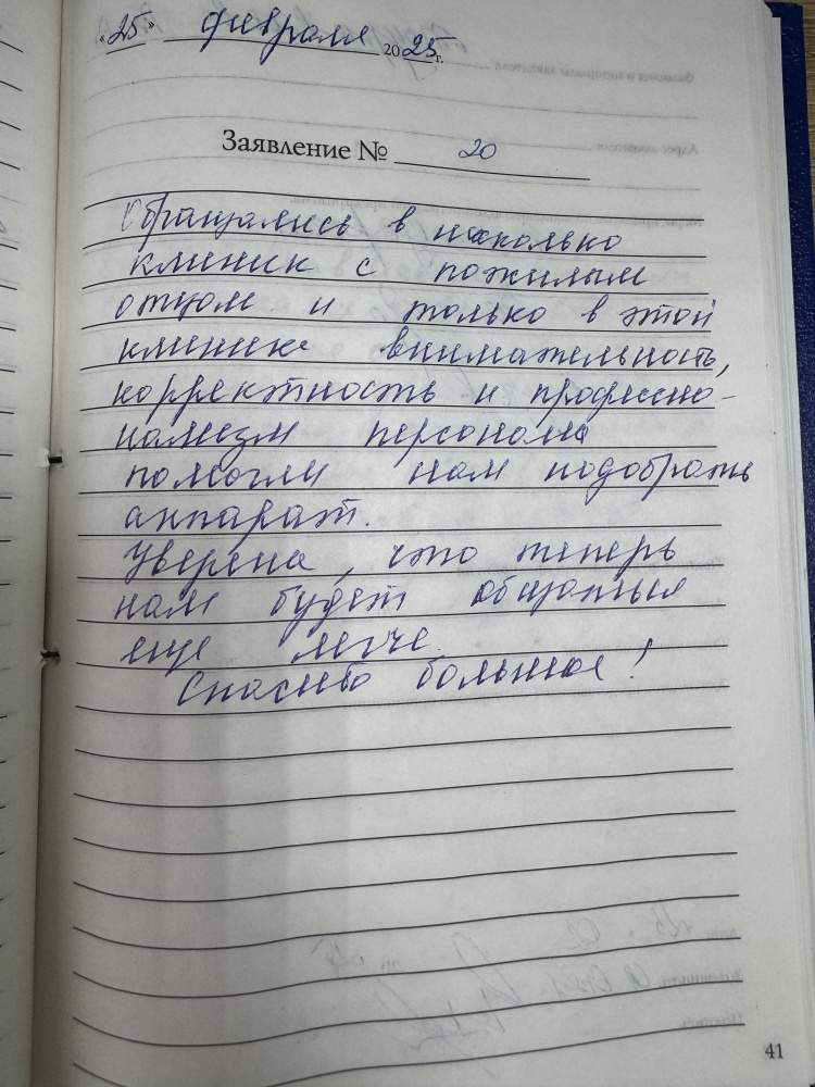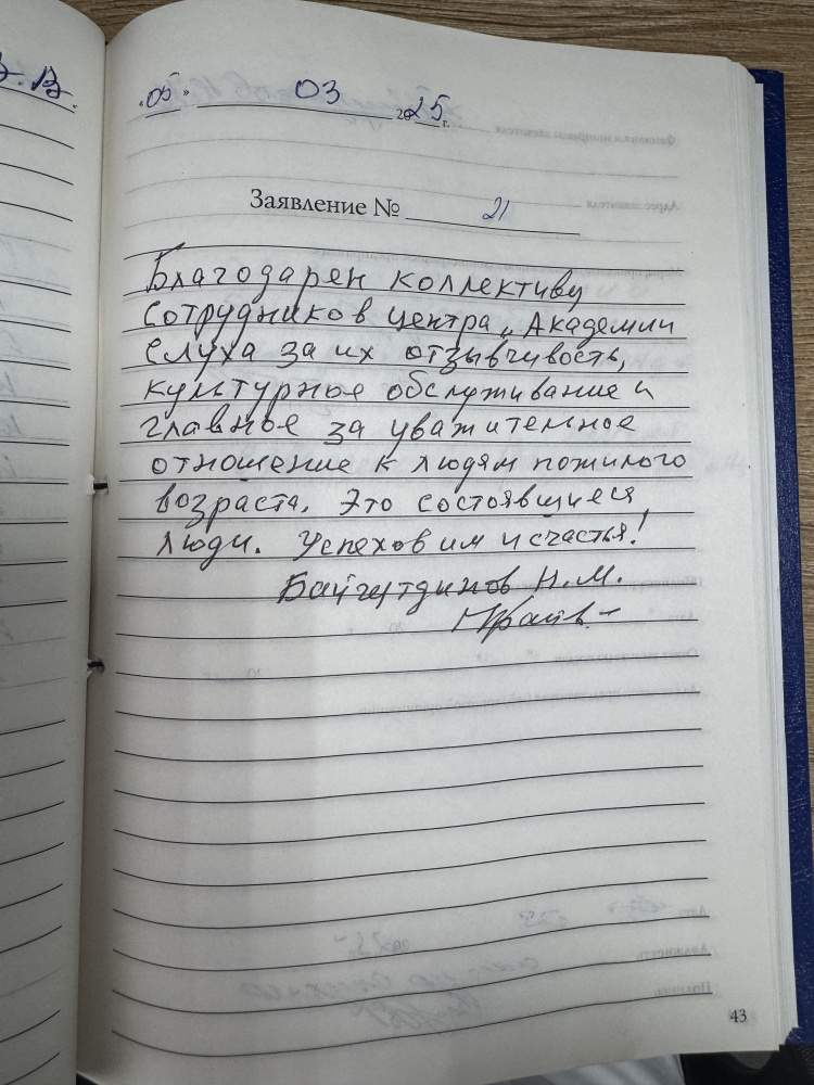 11.03.2025 Я, Лезликова Лидия Дмитриевна, находилась в "Академии слуха", где прошла обследование. Благодарю за внимание, которое оказывали специалисты в течение 1,5 - 2 часов. Хочется пожелать Здоровья, удачи в их делах и долго оказывать помощь нашему брату - престарелым и при необходимости - молодежи. Спасибо!