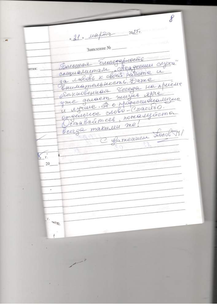 Большая благодарность специалистам "Академии Слуха" за любовь к своей работе и внимательность . Даже обыкновенная беседа на приёме уже делает жизнь ярче и лучше. А о профессионализме отдельное слово- Спасибо. Оставайтесь, пожалуйста, всегда такими же!
