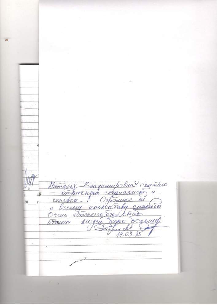 Наталья Владимировна, считаю-отличный специалист и человек! Огромное ей и всему коллективу спасибо. Очень хотелось бы, чтоб таких людей было больше.