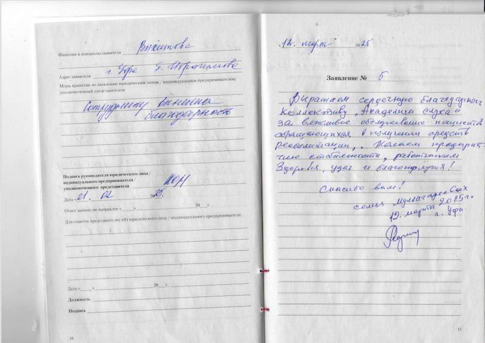 Выражаем сердечную благодарность коллективу "Академии слуха" за вежливое обслуживание пациентов, обращающихся за получением средств реабилитации. Желаем предприятию стабильности, работникам здоровья, удачи и благополучия! спасибо вам! Семья Муллагареевых