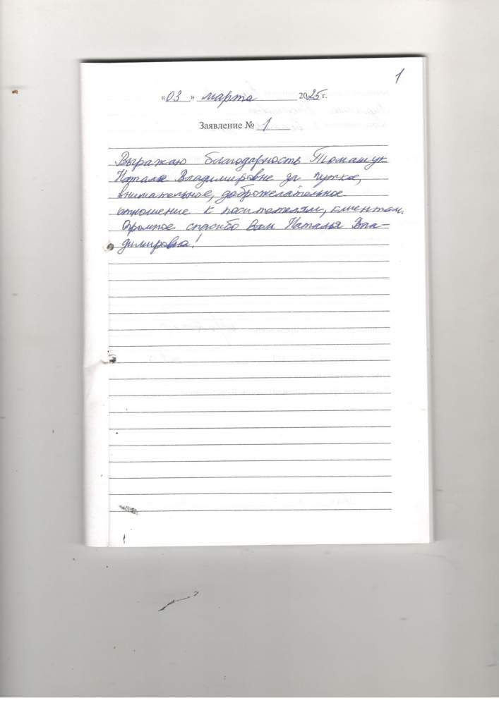 Выражаю благодарность Томашук Наталье Владимировне за чуткое, внимательное, доброжелательное отношение к посетителям, клиентам. Огромное спасибо Вам ,Наталья Владимировна!