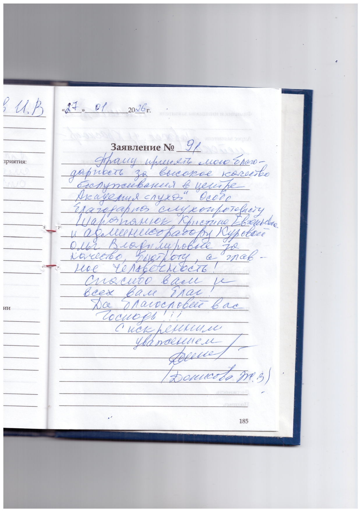 Прошу принять мою благодарность за высокое качество обслуживания в центре "Академия Слуха". Особо благодарна слухопротезисту Шарапанюк Кристине Евгеньевне и администратору Куровой Ольге Владимировне за качество, быстроту, а главное, человечность!