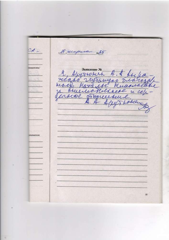 Я, арутюнян АА выражаю глубокую благодарность Наталье Николаевне за внимательное и сердечное отношение