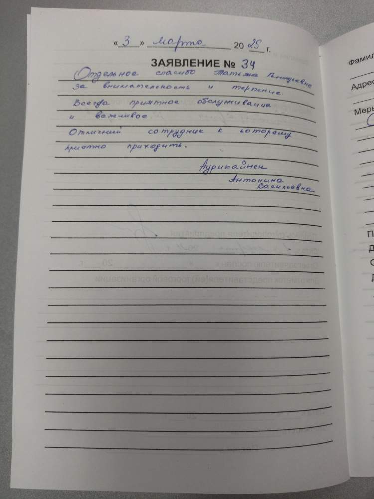 Отдельное спасибо Татьяне Геннадьевне за внимательность и терпение. Всегда приятное обслуживание и вежливое. Отличный сотрудник, к которому приятно приходить.