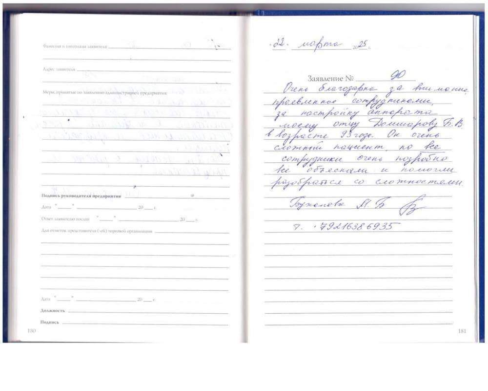 Очень благодарна за внимание, проявленное сотрудниками, за поднастройку аппарата моему отцу Домшарову Б.В. в возрасте 93 года. Он очень сложный пациент. но все сотрудники очень подробно всё объяснили и помогли разобраться со сложностями. Буханова М.Б.