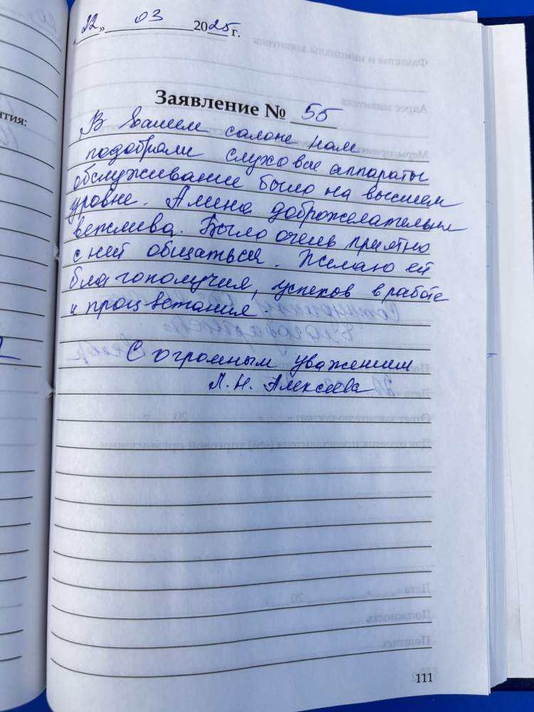 В вашем салоне нам подобрали слуховые аппараты, обслуживание было на высшем уровне. Алина доброжелательна, вежлива. Было очень приятно с ней общаться. Желаю ей благополучия, успехов в работе и процветания. С огромным уважением, Л.Н. Алексеева.