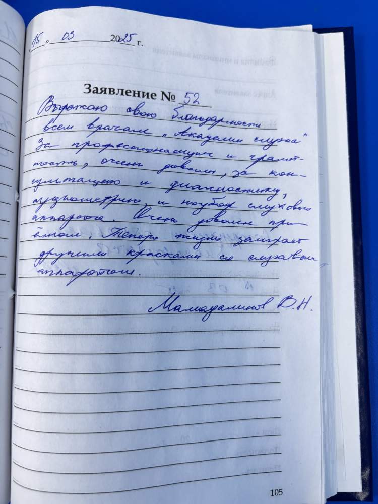 Спасибо дружному коллективу "Академия слух" за помощь в подборе слухового аппарата, за доброе отношение, понимание, отзывчивость и сердечность. Всего самого наилучшего Вам!