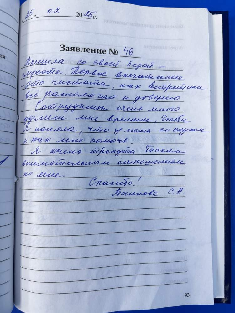 Пришла со своей бедой - глухота. Первое впечатление - это чистота, как встретили, всё располагает к доверию. Сотрудники очень много уделили мне времени, чтобы я поняла, что у меня со слухом и как мне помочь. Я очень тронута таким внимательным отношением ко мне. Спасибо!