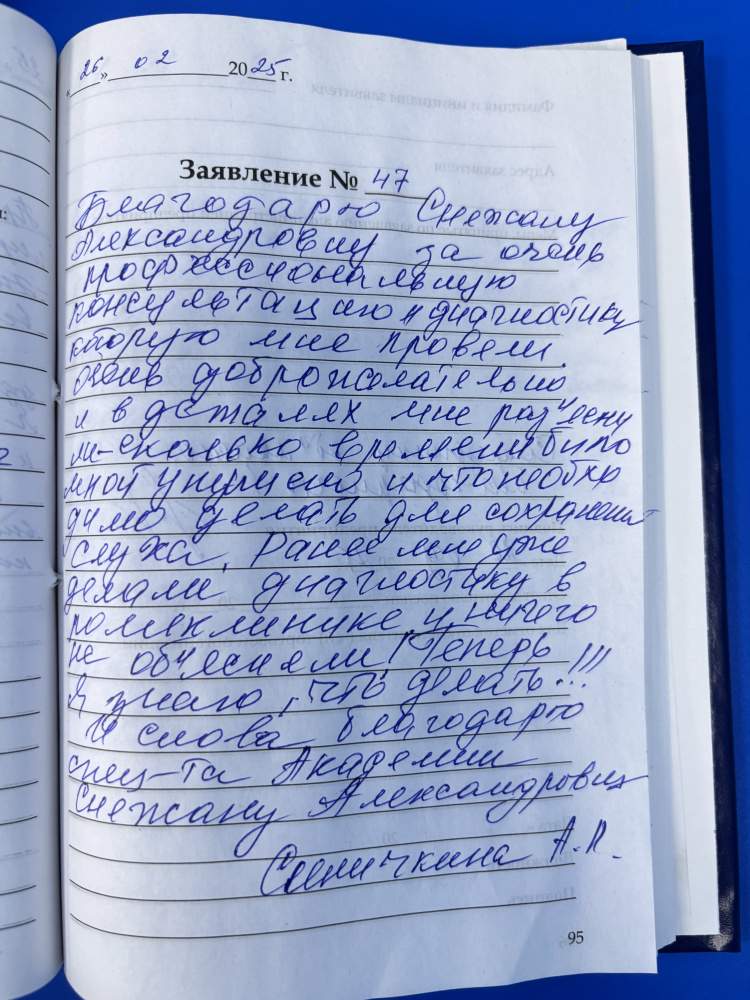 Благодарю Снежану Александровну за очень профессиональную консультацию и диагностику, которую мне провели. Очень доброжелательно и в деталях мне разъяснили - сколько времени было мной упущено и что необходимо делать для сохранения слуха. Ранее мне уже делали диагностику в поликлинике и ничего не объяснили! Теперь я знаю, что делать!!! И снова благодарю спец-та Академии Снежану Александровну.
