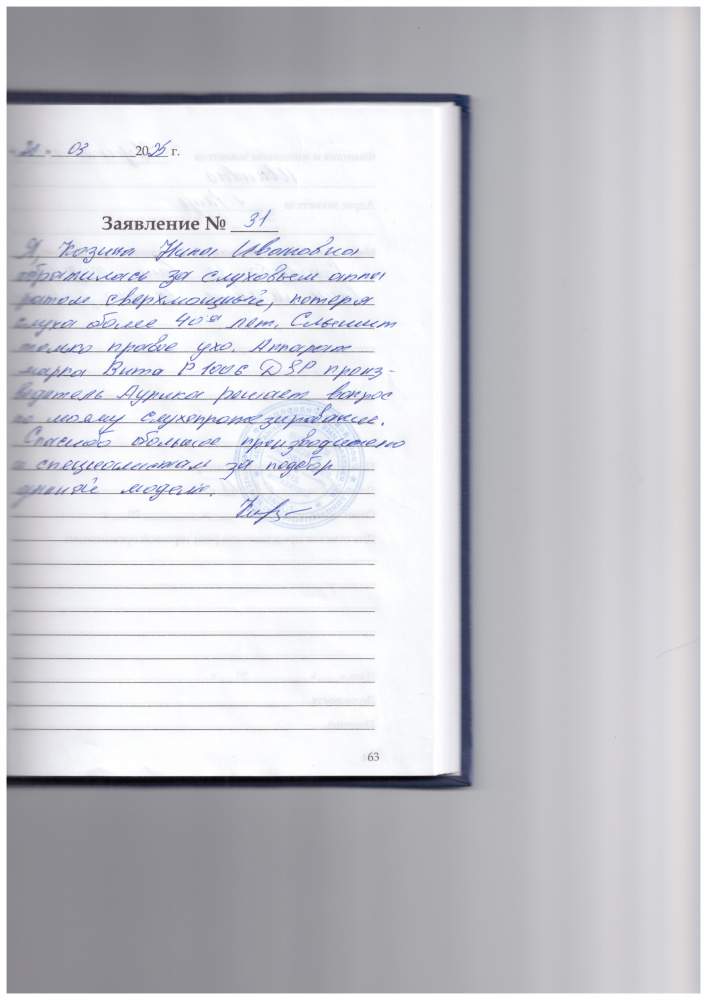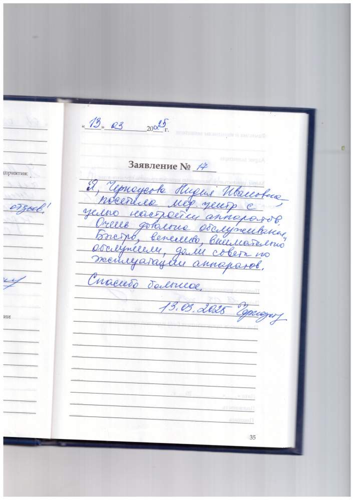 Я, Черноусова Лидия Ивановна, посетила мед.центр с целью настройки аппаратов. Очень довольна обслуживанием. Быстро, вежливо, внимательно обслужили, дали советы по эксплуатации аппаратов. Спасибо большое. 13.03.2025