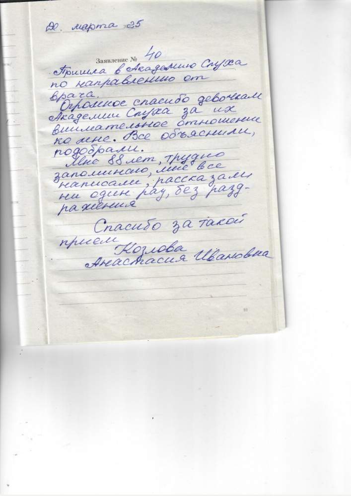 Пришла в Академию Слуха по направлению от врача. Огромное спасибо девочкам Академии слуха за их внимательное отношение ко мне. Все объяснили, подобрали. Мне 88 лет ,трудно запоминаю, мне все написали, рассказали ни один раз, без раздражения. Спасибо за такой прием.