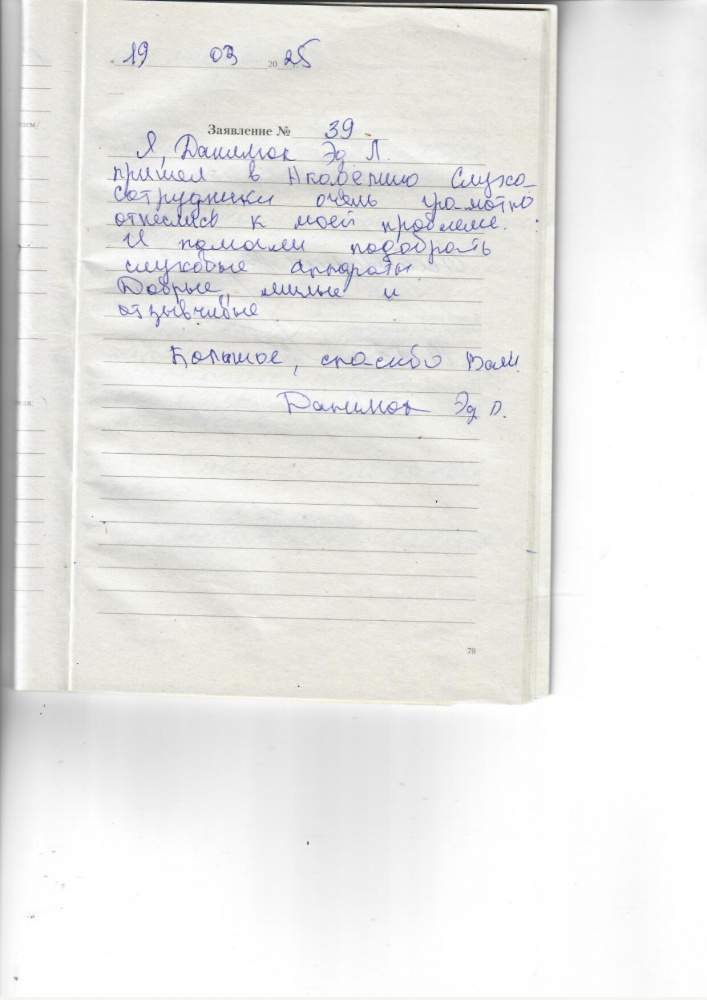 Я, Данилюк Э.Л пришел в академию слуха. Сотрудники очень грамотно отнеслись к моей проблеме. И помогли подобрать слуховые аппараты. Добрые, милые и отзывчивые. Большое спасибо.