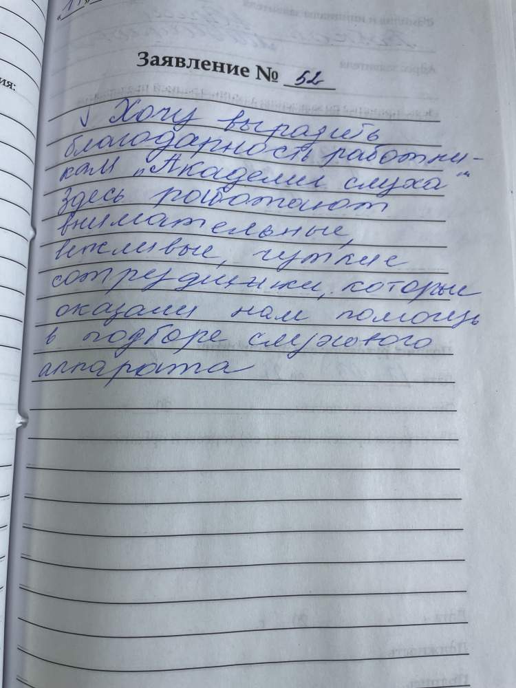 Хочу выразить благодарность работникам " Академии слуха".Здесь работают внимательные, вежливые, чуткие сотрудники, которые оказали нам помощь в подборе слухового аппарата