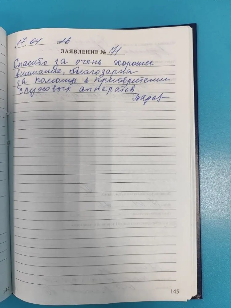 Спасибо за очень хорошее внимание, благодарна за помощь в приобретении слуховых аппаратов                                                             подпись