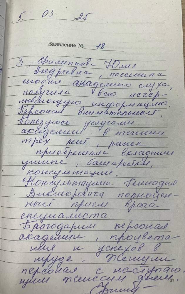 Я, Филиппова Юлия Андреевна, посетила сегодня Академию слуха, получила всю исчерпывающую информацию. Персонал внимательный. Пользуюсь услугами Академии слуха в течении трех лет, ранее приобретала вкладыши ушные, батарейки, консультации. Консультации Геннадия Викторовича – полноценный прием врача специалиста. Благодарим персонал Академии, процветания и успехов в труде. Женский персонал с наступающим женским днем. 05.03.2025