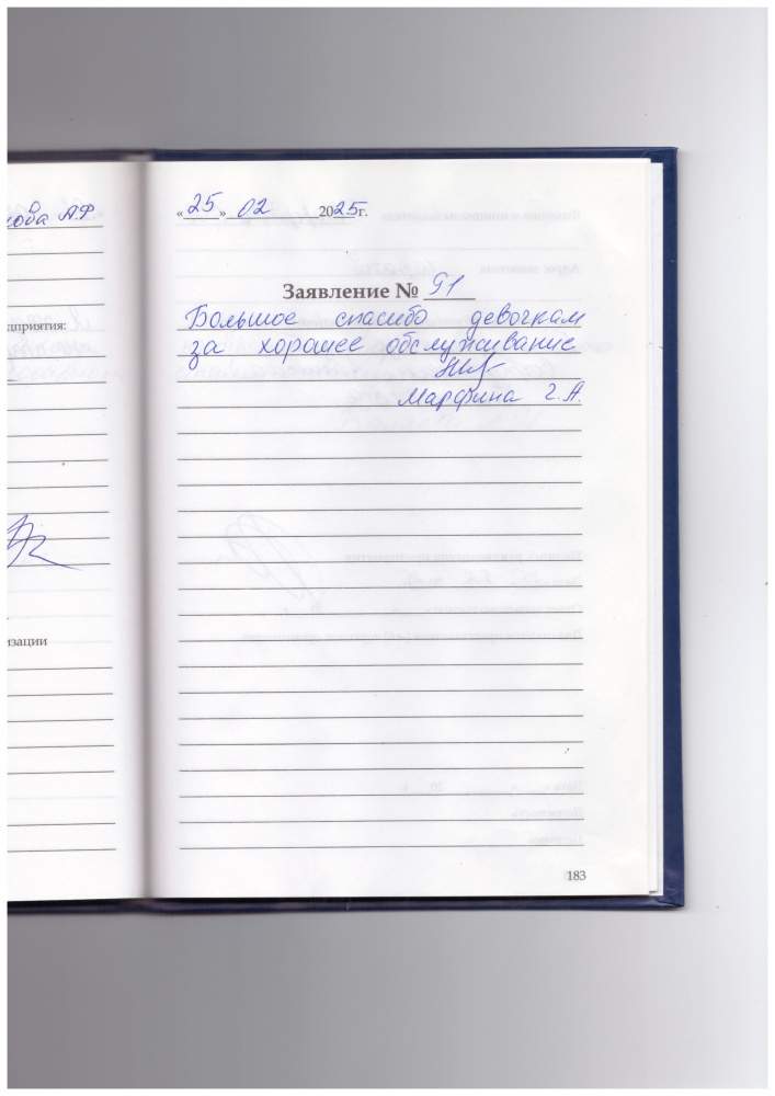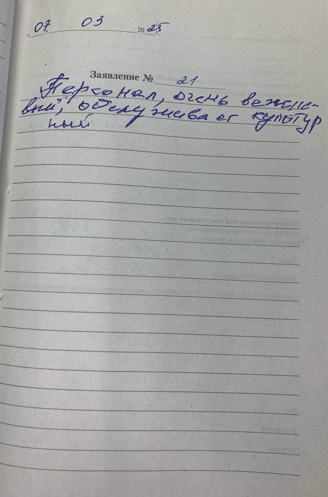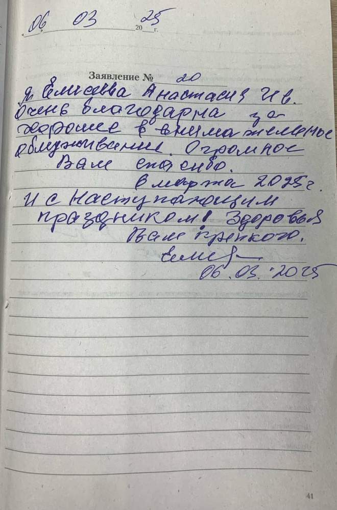 Я, Елисеева Анастасия Ив., очень благодарю за хорошее внимательное обслуживание. Огромное вам спасибо. 06.03.2025 И с Наступающим праздником! Здоровья Вам крепкого. 06.03.2025