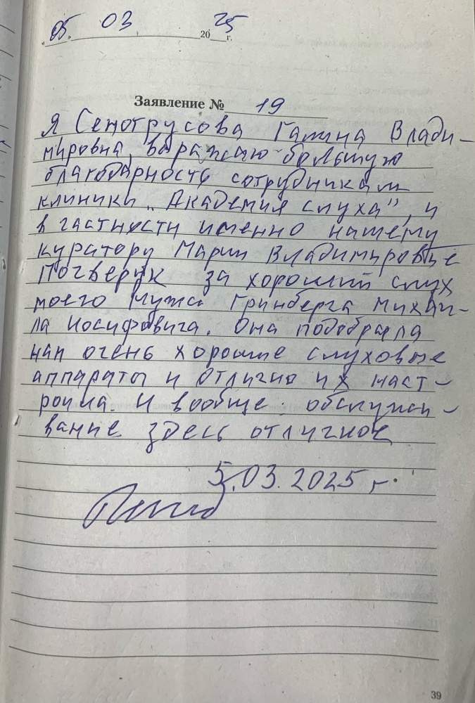 Я, Сенотрусова Галина Владимировна, выражаю большую благодарность сотрудникам клиники «Академия слуха», и в частности именно мастеру куратору Марии Владимировна Почверук за хороший слух моего мужа. Гринберг Михаила Иосифовича. Она подобрала нам очень хорошие слуховые аппараты и отлично их настроила, и вообще обслуживание здесь отличное. 05.03.2025