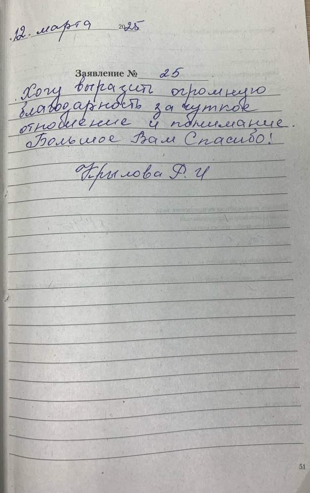 Хочу выразить огромную благодарность за чуткое отношение и понимание. Большое Вам спасибо! Крылова Р.И.