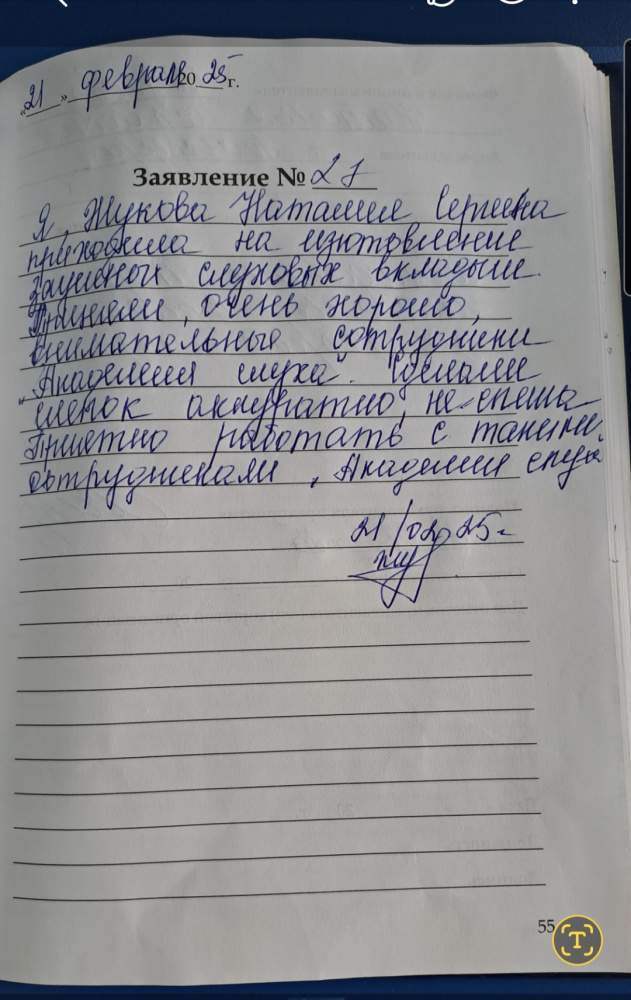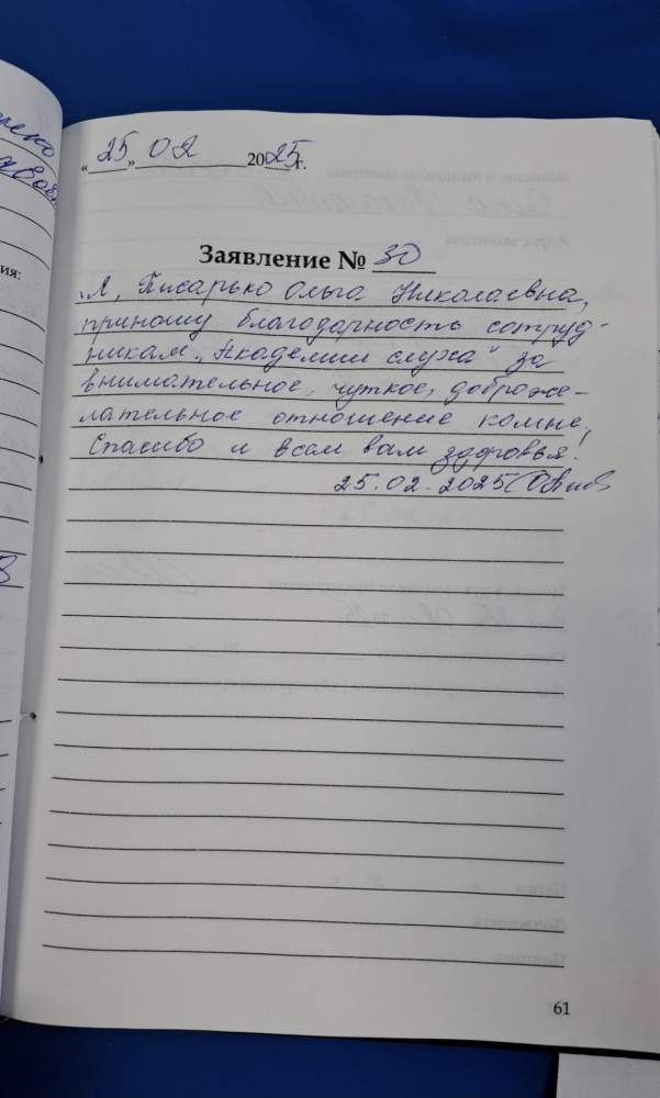я, Писарько Ольга Николаевна, приношу благодарность сотрудникам "Академии слуха" за внимательное, чуткое, доброжелательное отношение ко мне.