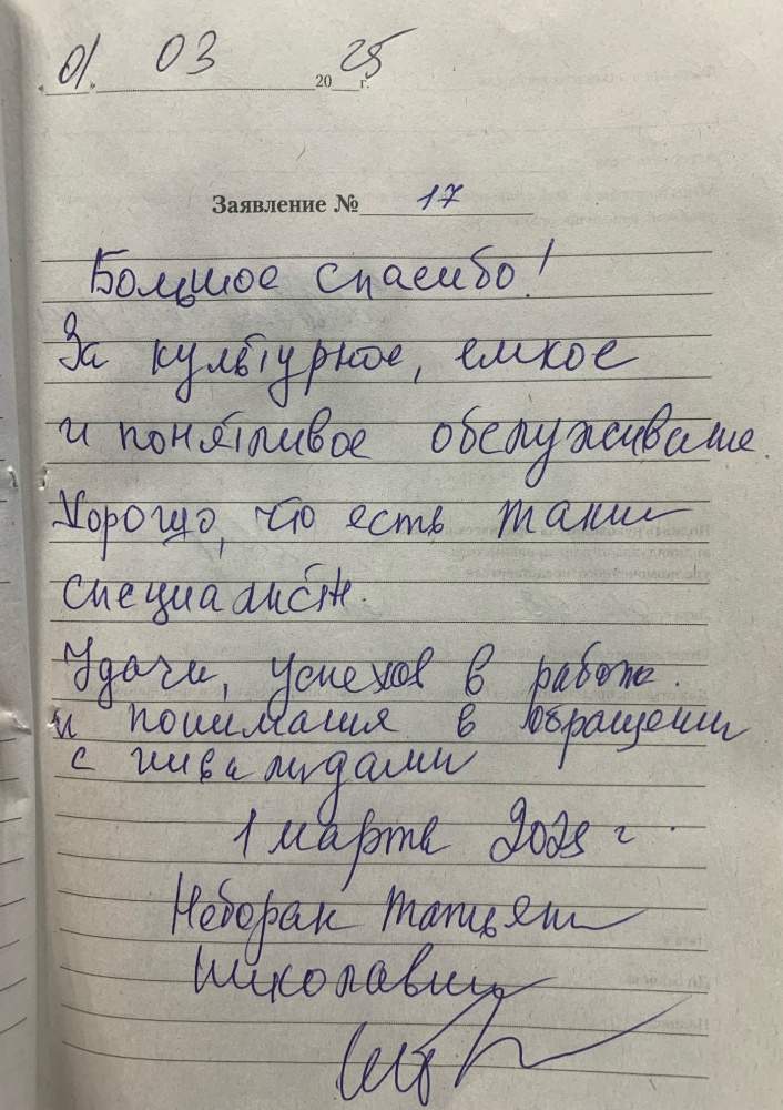 Большое спасибо! За культурное, емкое и понятливое обслуживание, хорошо, что есть такие специалисты. Удачи, успехов в работе и понимания в обращении с инвалидами. 01.03.2025