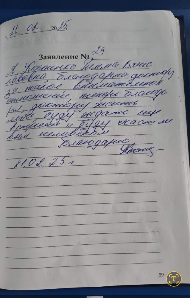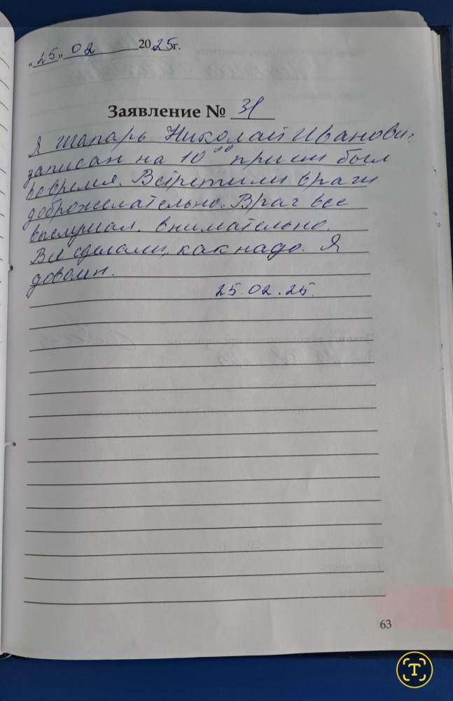 Я, Шапарь Николай Иванович записан на 10:00 прием был вовремя. Встретили врачи доброжелательно. Врач все выслушал внимательно. Все сделали как надо. Я доволен.