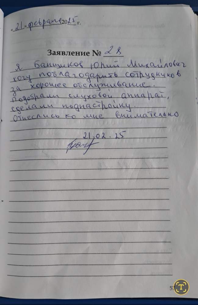 Я, Банщиков Юрий Михайлович, хочу поблагодарить сотрудников за хорошее обслуживание. Подобрали слуховой аппарат. Сделали поднастройку. Отнеслись ко мне внимательно.