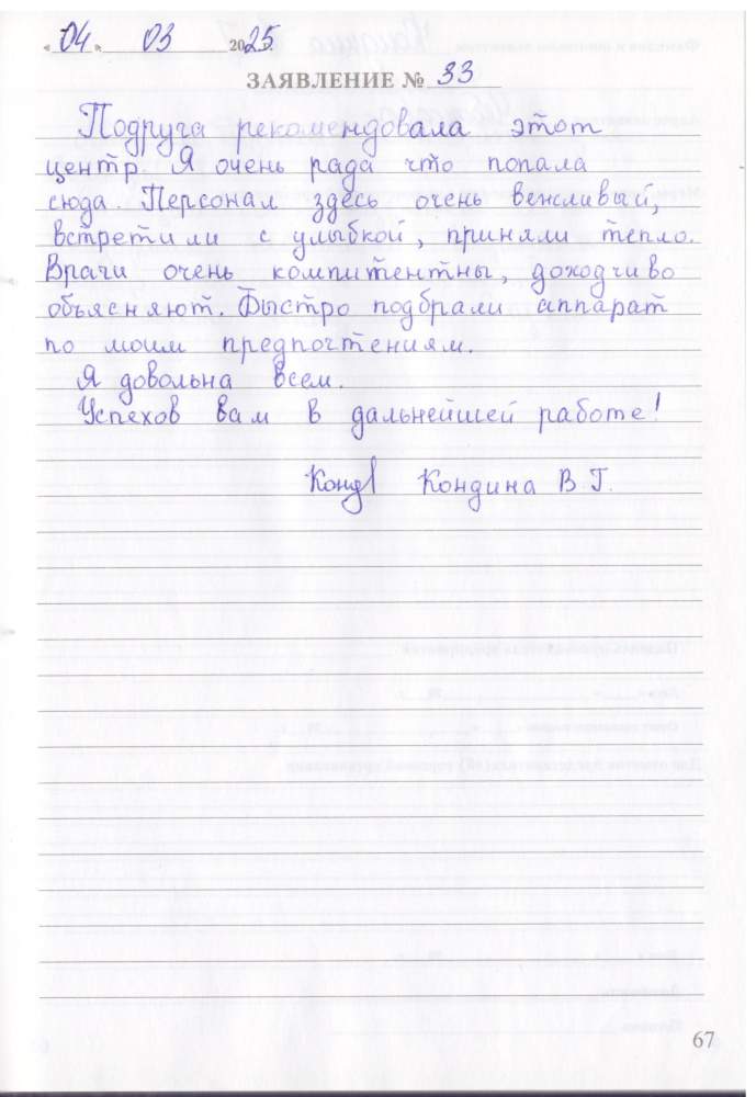 Подруга рекомендовала этот центр. Я очень рада что попала сюда. Персонал здесь очень вежливый, встретили с улыбкой, приняли тепло. Врачи очень компетентны, доходчиво объясняют. Быстро подобрали аппарат по моим предпочтениям. Я довольна всем. Успехов вам в дальнейшей работе!