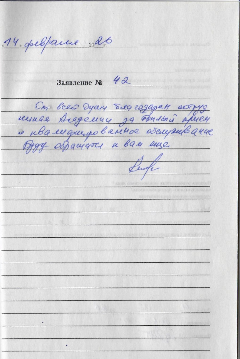 От всей души благодарен сотрудникам Академии за тёплый приём и квалифицированное обслуживание. Буду обращаться к вам ещё.