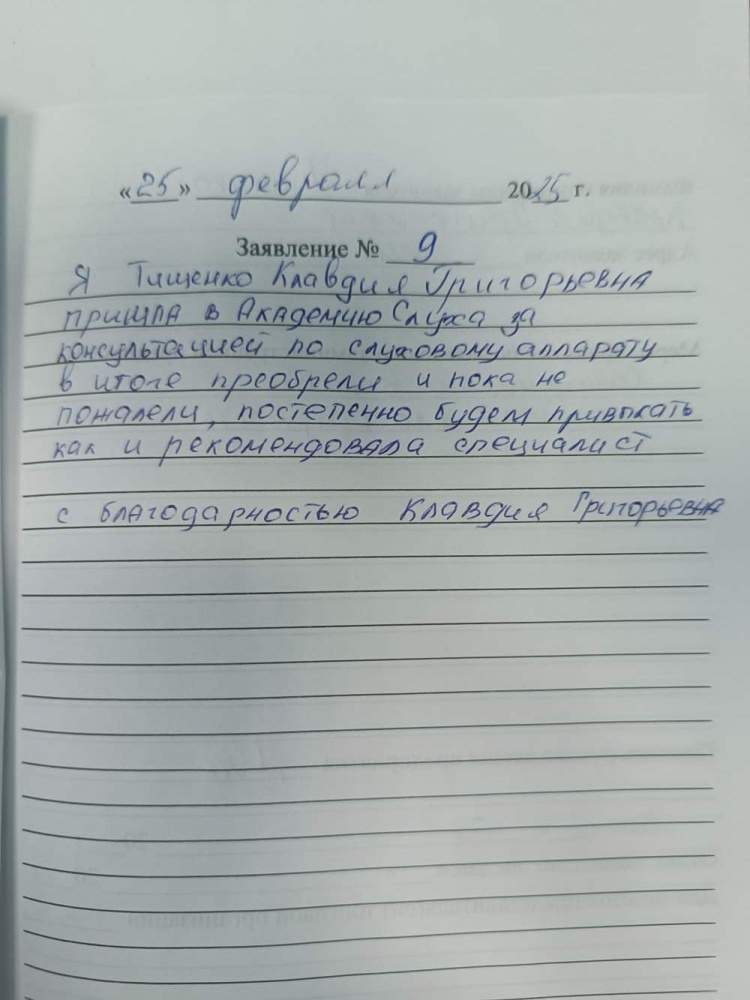 Я Тищенко Клавдия Григорьевна пришла в Академию Слуха за консультацией по слуховому аппарату в итоге приобрели и пока не пожалели, постепенно будем привыкать как и рекомендовала специалист. С благодарностью Клавдия Григорьевна
