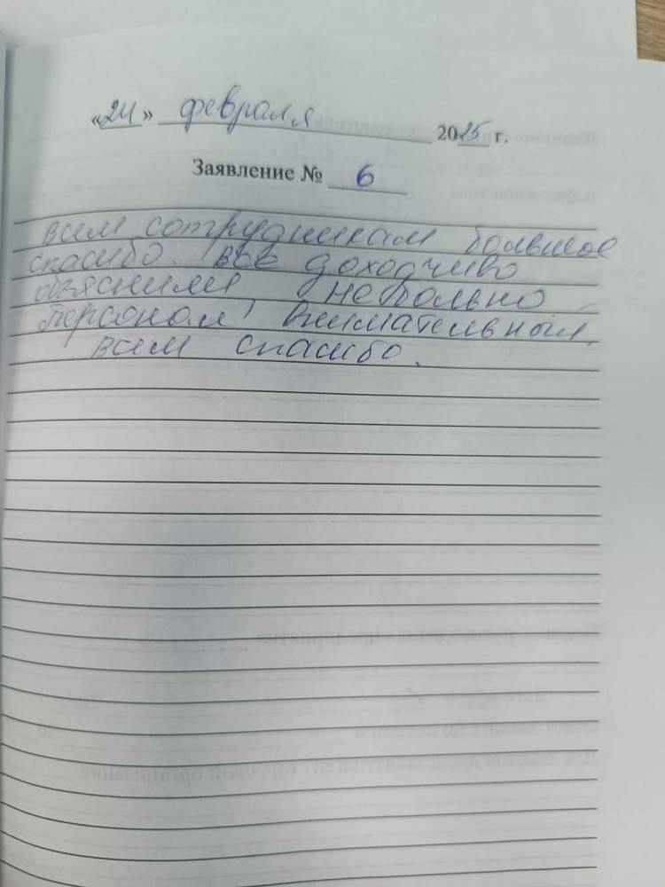 Всем сотрудникам большое спасибо. Всё доходчиво объяснили, не больно. Персонал внимательный. Всем спасибо.