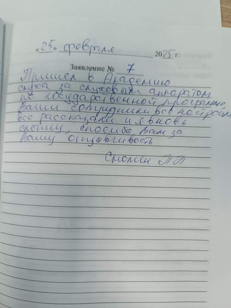 Пришёл в Академию слуха за слуховым аппаратом по государственной программе, Ваши сотрудники всё настроили, всё рассказали и я вновь слышу, спасибо Вам за Вашу отзывчивость. Смолин П П