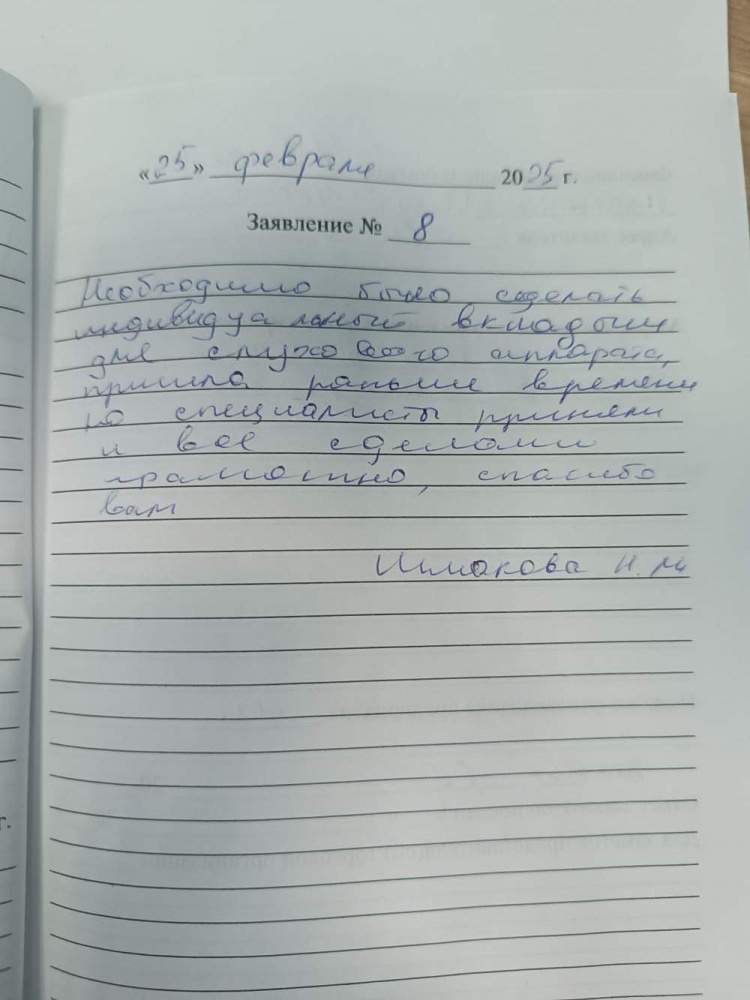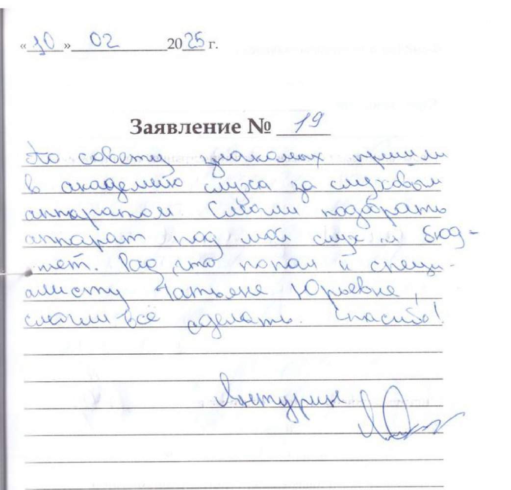 Необходимо было сделать индивидуальный вкладыш для слухового аппарата, пришла раньше времени, но специалисты приняли и всё сделали грамотно, спасибо вам. Шмакова Н.М