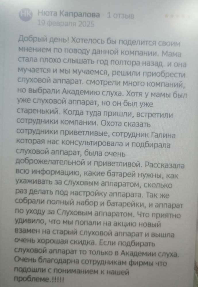 Добрый день! Хотелось бы поделится своим мнением по поводу данной компании. Мама стала плохо слышать год полтора назад. и она мучается и мы мучаемся, решили приобрести слуховой аппарат. смотрели много компаний, но выбрали Академию слуха. Хотя у мамы был уже слуховой аппарат, но он был уже старенький. Когда туда пришли, встретили сотрудники компании. Охота сказать сотрудники приветливые, сотрудник Галина которая нас консультировала и подбирала слуховой аппарат, была очень доброжелательной и приветливой. Рассказала всю информацию, какие батарей нужны, как ухаживать за слуховым аппаратом, сколько раз делать под настройку аппарата. Так же собрали полный набор и батарейки, и аппарат по уходу за Слуховым аппаратом. Что приятно удивило, что мы попали на акцию новый взамен на старый слуховой аппарат и вышла очень хорошая скидка. Если подбирать слуховой аппарат то только в Академии слуха. Очень благодарна сотрудникам фирмы что подошли с пониманием к нашей проблеме.!!!!!