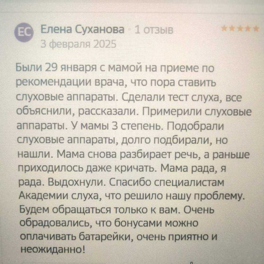 Были 29.января с мамой на приеме по рекомендации врача, что пора ставить слуховые аппараты. сделали тест слуха, все объяснили, рассказали. примерили слуховые аппараты. у мамы 3 степень. подобрали слуховые аппараты, долго подбирали, но нашли. мама снова разбирает речь, а раньше приходилось даже кричать. Мама рада, я рада. Выдохнули. Спасибо специалистам Академии слуха, что решило нашу проблему. Будем обращаться только к вам. Очень обрадовались, что бонусами можно оплачивать батарейки, очень приятно и неожиданно!