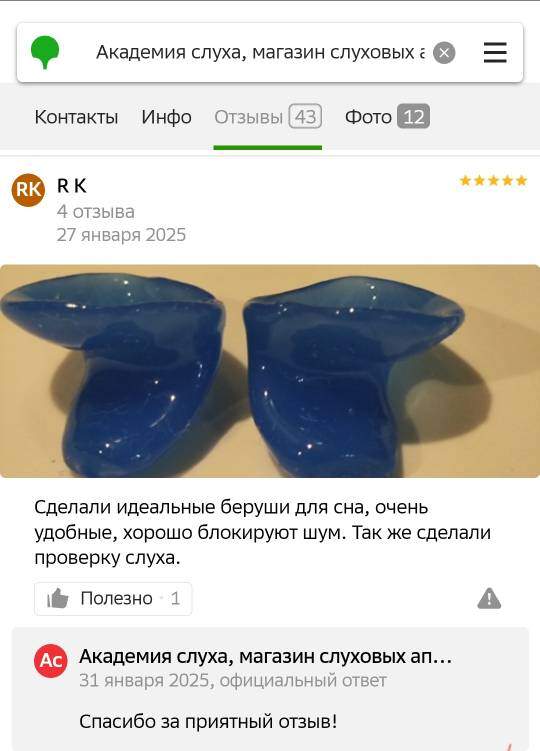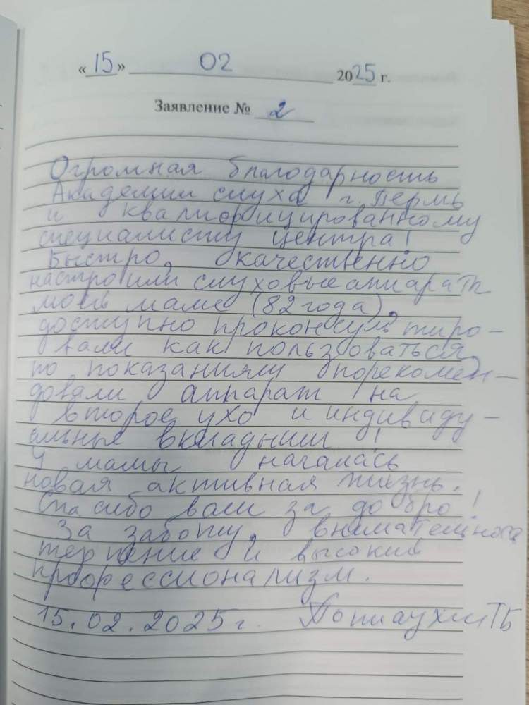 Огромная благодарность Академии слуха г. Пермь и квалифицированному специалисту центра! Быстро, качественно настроили слуховые аппараты моей маме (82 года), доступно проконсультировали как пользоваться, по показаниям порекомендовали аппарат на второе ухо и индивидуальные вкладыши! У мамы началась новая активная жизнь. Спасибо вам за добро! За заботу, внимательность терпение и высокий профессионализм.