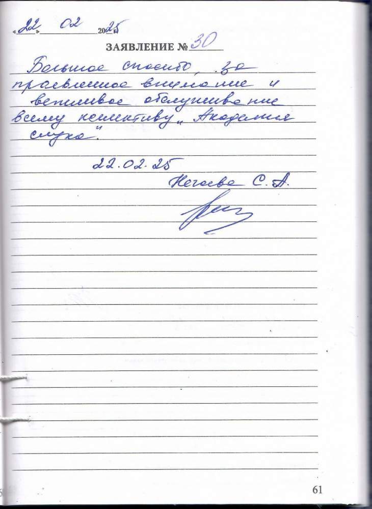 1. Большое спасибо за проявленное внимание и вежливое обслуживание всему коллективу Академии слуха. Нечаева С.А 22.02.25г
