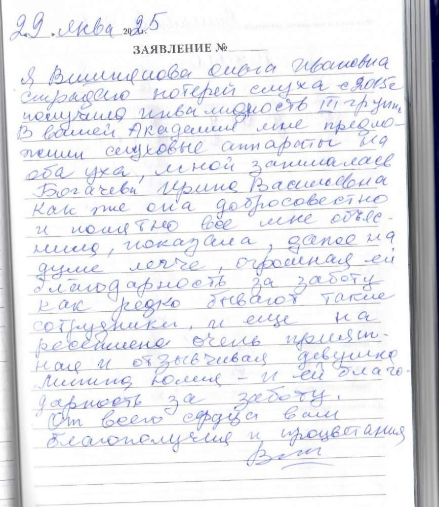 Я, Вишнякова Ольга Ивановна, страдаю потерей слуха с 2015г., получила инвалидность 3 группы. В Вашей «Академии» мне предложили слуховые аппараты на оба уха, мной занималась Богачёва Ирина Васильевна, как же она добросовестно и понятно мне всё объяснила, показала, даже на душе легче, огромная ей благодарность за заботу. Как редко бывают такие сотрудники, и ещё на ресепшене очень приятная и отзывчивая девушка Липина Юлия – и ей благодарность за заботу. От всего сердца вам благополучия и процветания.