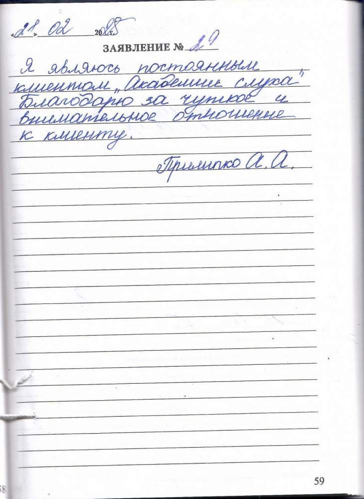 Я являюсь постоянным клиентом Академии слуха. Благодарю за чуткое и внимательное отношение к клиенту. Прилипко А.А 21.02.25г