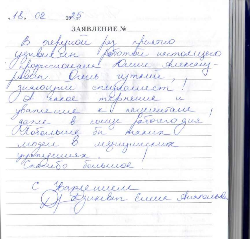 В очередной раз приятно удивлен работой настоящего профессионала Юлии Александровны. Очень чуткий, знающий специалист! А какое терпение и уважение к пациентам дали в конце рабочего дня! Побольше бы таких людей в медицинских учреждениях! Спасибо большое! С Уважением, Дзикевич Елена Анатольевна