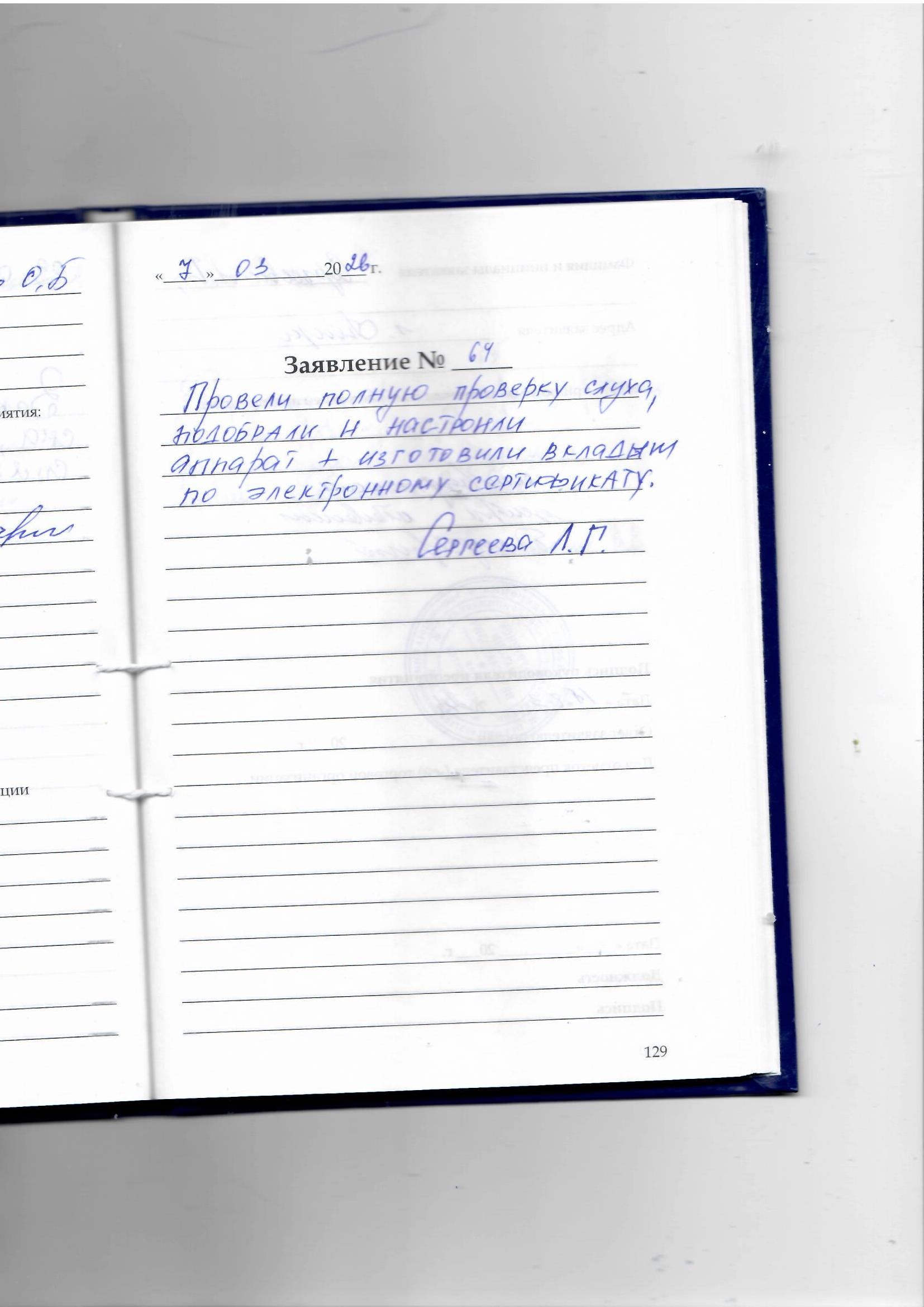 Провели полную проверку слуха, подобрали и настроили аппарат + изготовили вкладыш по электронному сертификату.