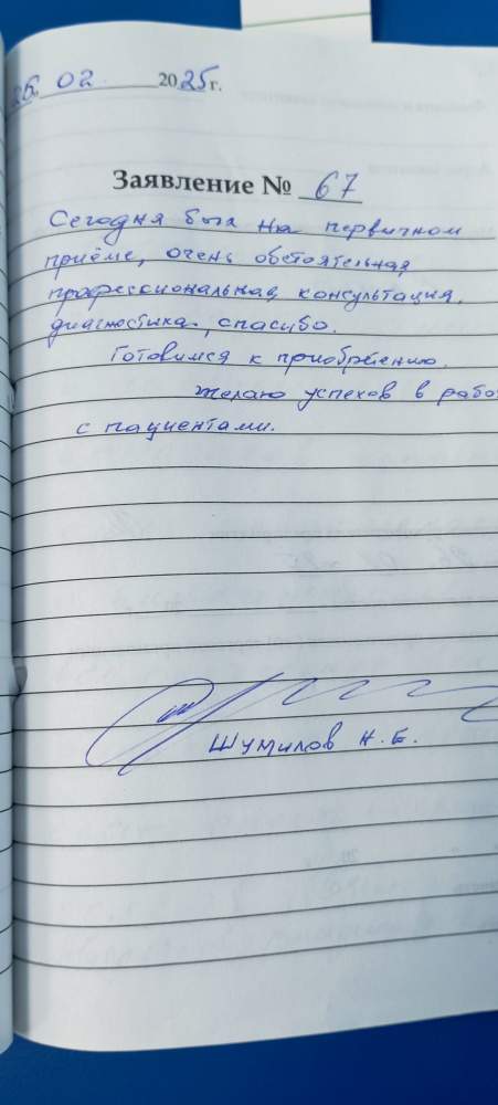 Сегодня был на первичном приеме, очень обстоятельная, профессиональная консультация, диагностика, спасибо.