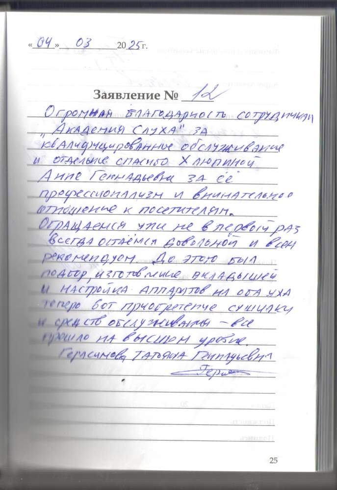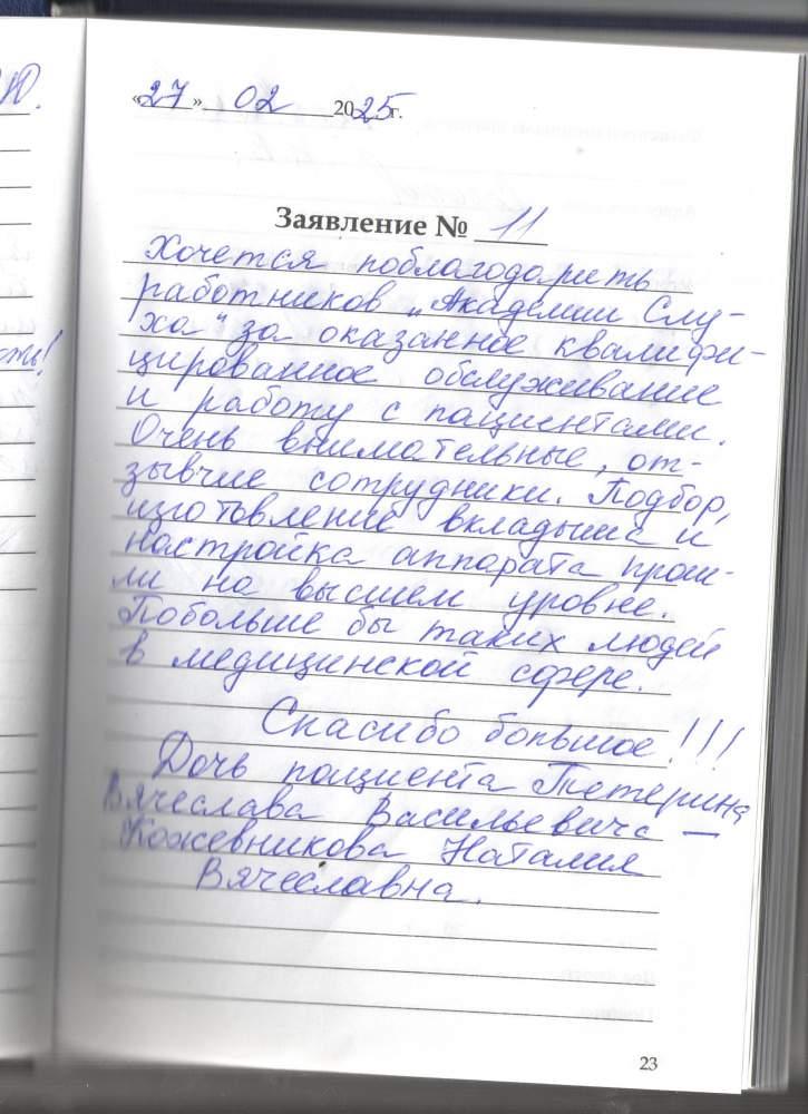 Хочется поблагодарить работников "Академии Слуха" за оказанное квалифицированное обслуживание и работу с пациентами. Очень внимательные, отзывчивые сотрудники. Подбор, изготовление вкладыша и настройка аппарата прошли на высшем уровне. Побольше бы таких людей в медицинской сфере. Спасибо большое!!! Дочь пациента Тетерина Вячеслава Васильевича - Кожевникова Наталия Вячеславовна.