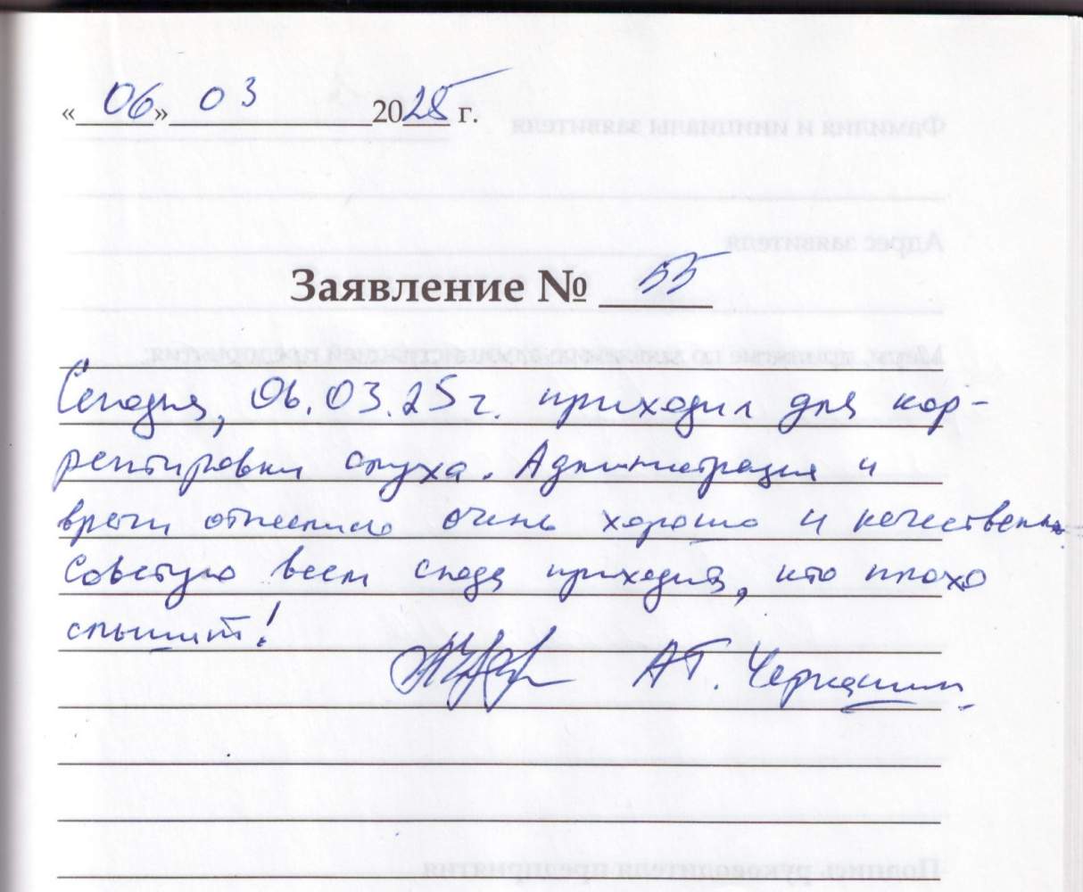 Сегодня 06.03.2025, приходили для корректировки слуха. Администрация и врачи отнеслись очень хорошо и качественно. Советую всем сюда приходить, кто плохо слышит!