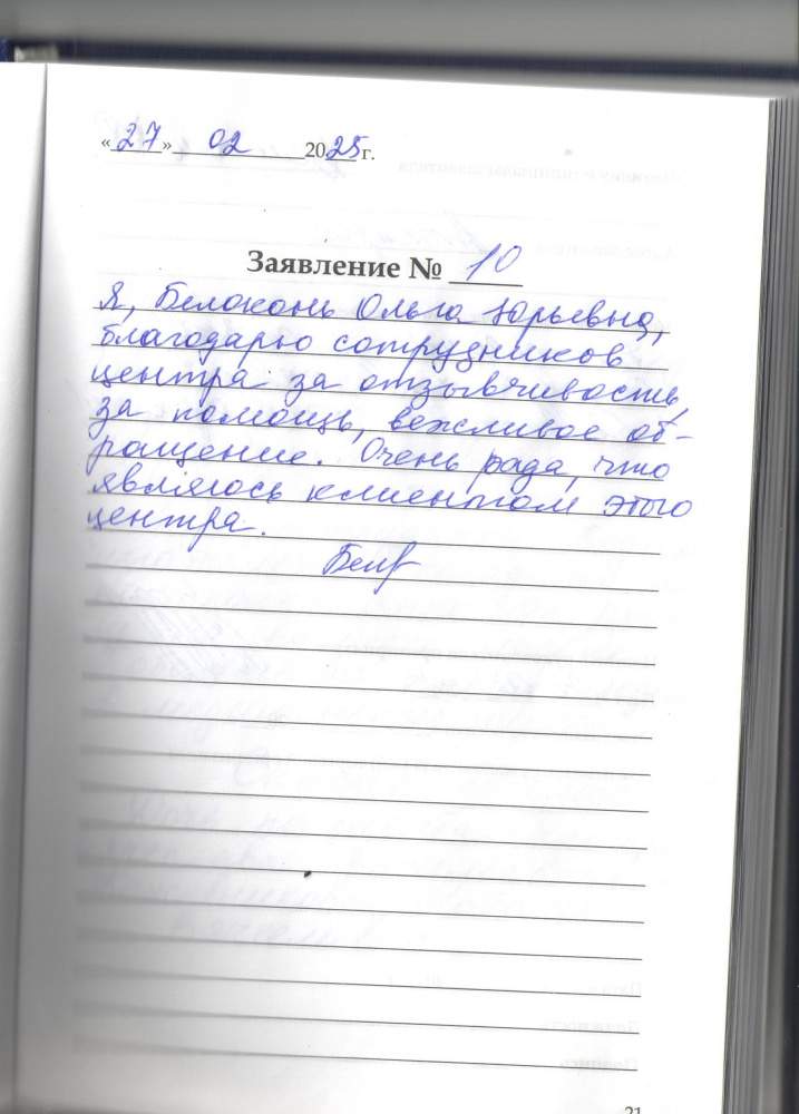 Я, Белоконь Ольга Юрьевна, благодарю сотрудников центра за отзывчивость, за помощь, вежливое обращение. Очень рада, что являюсь клиентом этого центра.